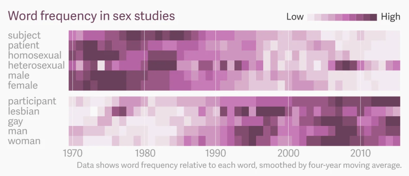 View project โI analyzed the language used in 4,545 sex research papers published from 1970 to 2017 in two journals of the field: the Journal of Sex Research and the Archives of Sexual Behavior. By tracking the most-used words over five decades, the analysis reveals how the language used in the field evolved alongside shifting sexual norms and societal attitudes.
