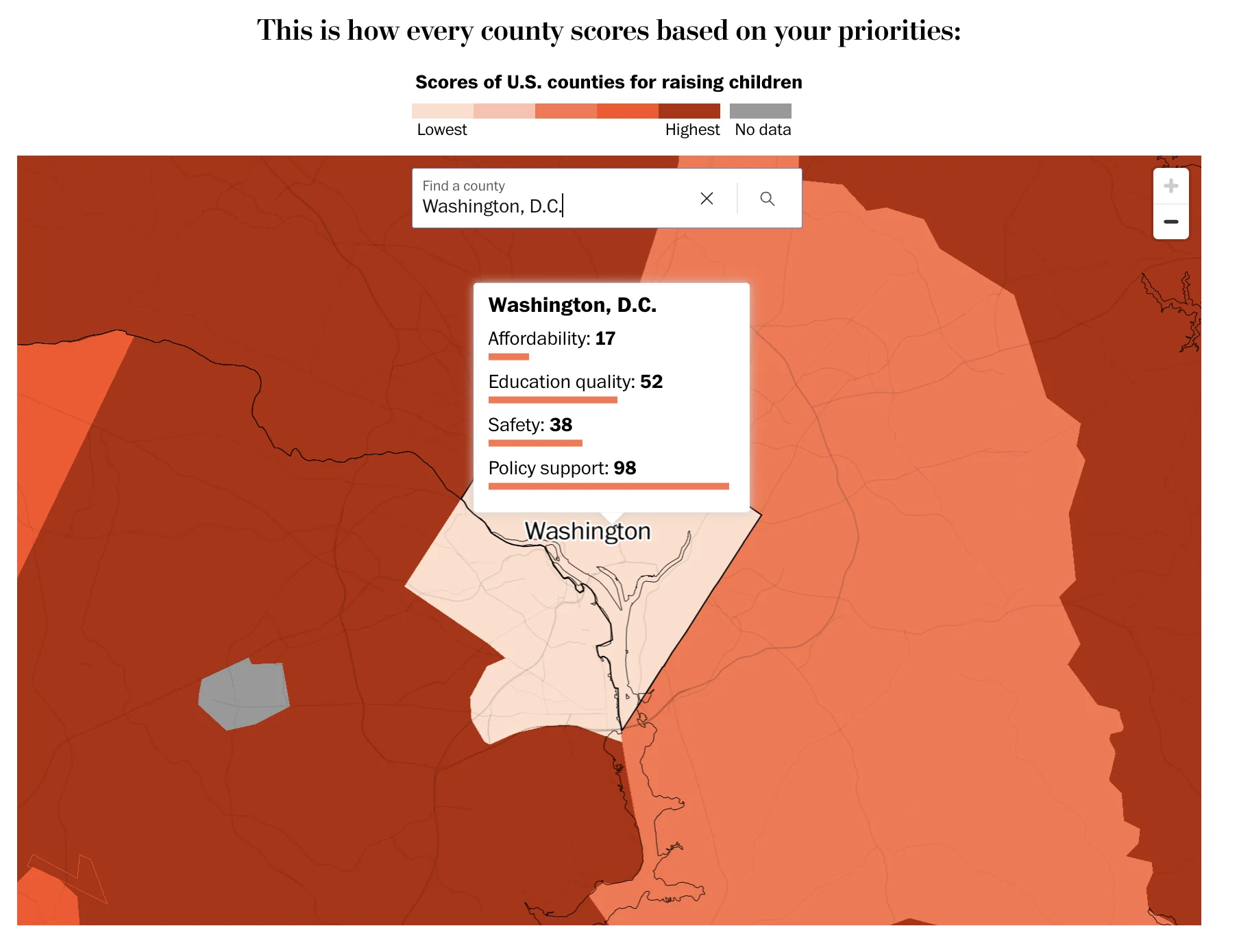 View project ↗The U.S. is reaching its lowest birth rate in history, but most young Americans still want children. The question is where they can afford and where kids will thrive. I scored every county across four metrics — affordability, education quality, safety, and state policies — and built an interactive tool that lets readers weight these priorities. The “best place” shifts dramatically depending on what each family values most.