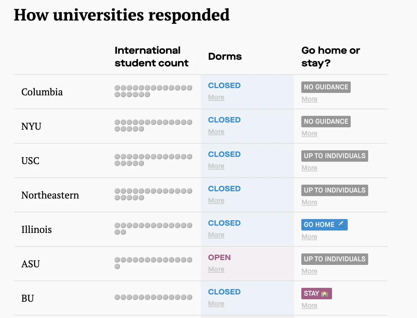View project ↗In March 2020, when residence halls closed across US universities, international students who couldn’t go back to their home countries because of travel restrictions were left with nowhere to go. I went to the top US universities with the largest share of international students and collected their instructions (or the lack of) for international students, and displayed them in this story.