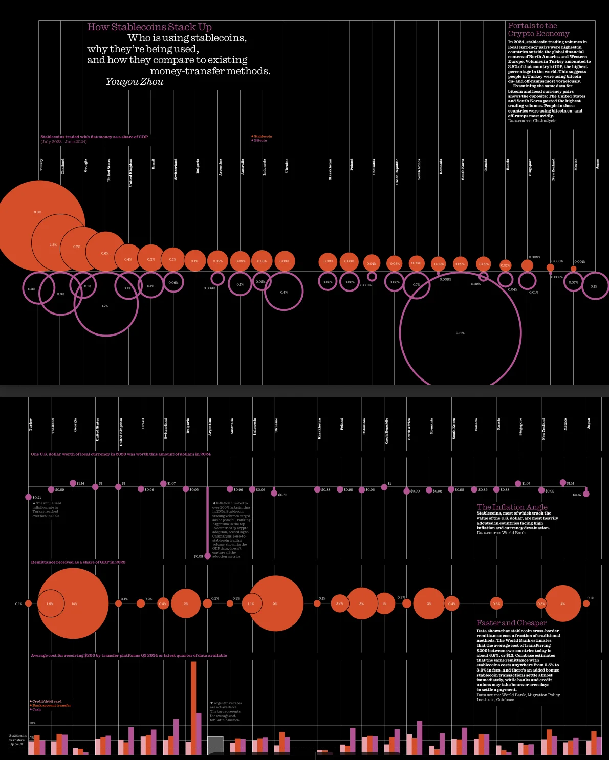 View project ↗I created a data visualization story for the first edition of (USE CASE)[https://www.usecase.xyz/], a new print magazine about what crypto enables around the world. The story occupies two full spreads of the A4-sized magazine. It shows who is using stablecoins, why they’re being used, and how they compare to existing money-transfer methods to explain why stablecoins took off.