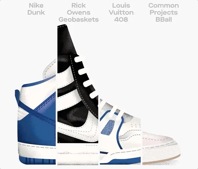 View project ↗I visually traced how nearly every popular luxury sneaker on the market — from Balenciaga’s sock sneakers to Rick Owens’ Ramones — derives directly from silhouettes originally designed by sports brands like Converse, Adidas, and Nike decades earlier.