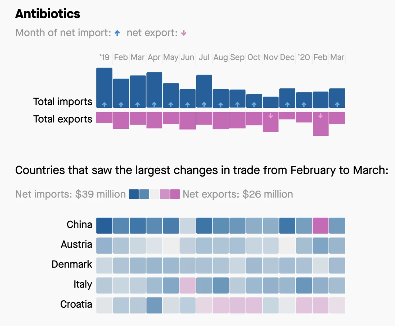 View project ↗I analyzes how COVID-19 disrupted US trade flows in March 2020. The data shows that antibiotics and gold became net imports due to surging domestic demand and shifts in trade with China.